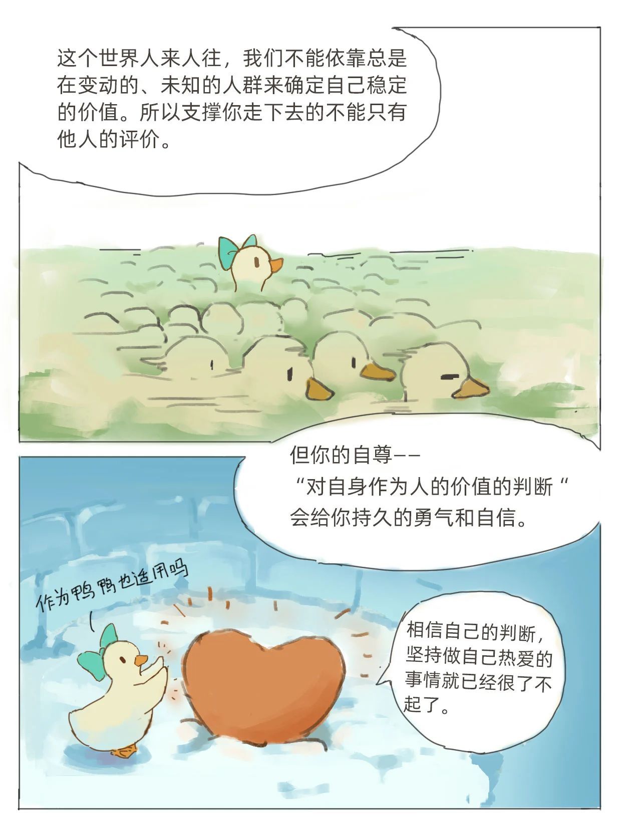 2025年3月2日,《央视新闻》公众号推送了我院优秀毕业生——@心理鸭创作的插画故事,主题为“如何对待来自他人的评价”。作者通过插画分享了关于自我接纳、正确对待他人评价的深刻见解,鼓励大家勇敢地做自己,拥有爱与被爱的能力。一起来看看吧! 如何对待来自他人的评价