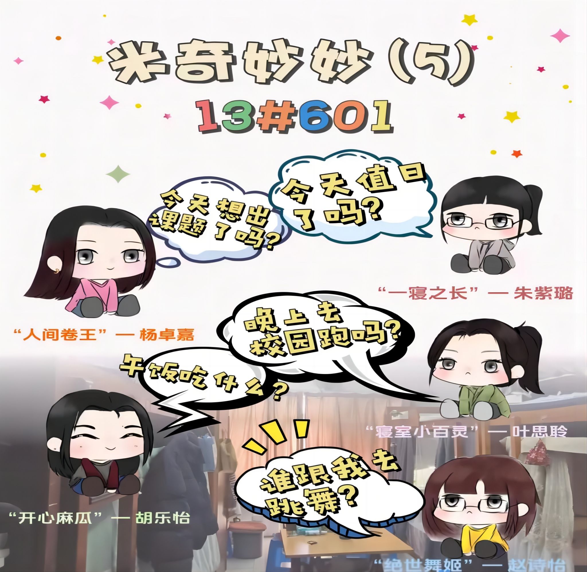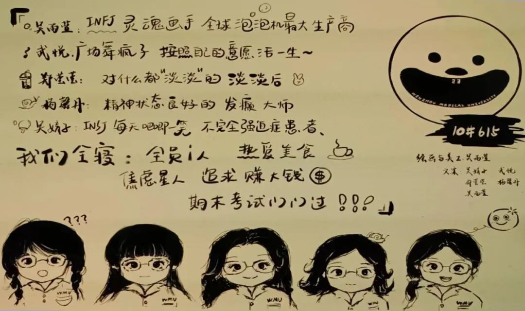 寝室名片 一等奖 来自13#601寝室 11#110寝室 手绘的人物画像配上真实的寝室背景,附着标识性的个人台词,确认过眼神,这就是“米奇妙妙(5)”的室友。