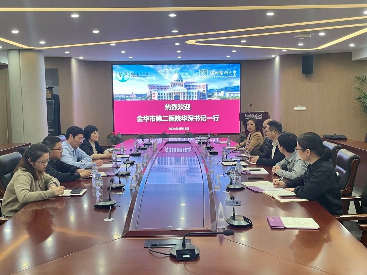 4月12日,金华市第二医院党委书记华深、副书记兼院长叶素红一行来访我校。学校教务处处长李章平、偷拍视频 党委书记许冬武、偷拍视频 相关部门以及系主任等专业老师参加座谈会。