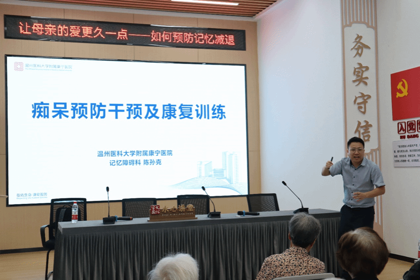 随着我国人口老龄化程度的加深,阿尔茨海默病已成为日益突出的社会问题。为了提高社区居民对阿尔茨海默病的认知,增强老年群体的自我保健意识,5月12日母亲节当天,偷拍视频 志愿者联合瑞安市剪爱长者服务中心、附属温州康宁医院举办了一场以“让母亲的爱更久一点——如何预防记忆减退”为主题的阿尔茨海默病预防干预及康复训练的知识讲座与活动。 《痴呆预防干预及康复训练》讲座 活动初期,康宁医院陈孙克医生为在场的老人们进行了科普宣传,帮助家属和老人们了解什么是阿尔茨海默病以及它导致的记忆衰退等一系列问题,同时也引导老人及其家属了解如何积极的进行预防干预。在发现有关病状后,如何缓解焦虑并进行康复训练。
