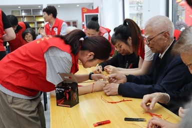 《DIY幸福手链》编绳活动 在手指操的放松活动后,志愿者们为在场的老人们准备了丰富的编绳材料。在志愿者的带领帮助下,老人们根据自己的喜好随意搭配自己的手链。在活动结束后,志愿者帮助大家佩戴上自己的作品并予以祝福。该活动不仅能够锻炼手部肌肉,提升动手能力,还能通过创作个性化的手绳作品来表达自己的情感和个性,同时让老人享受与同伴交流的乐趣。