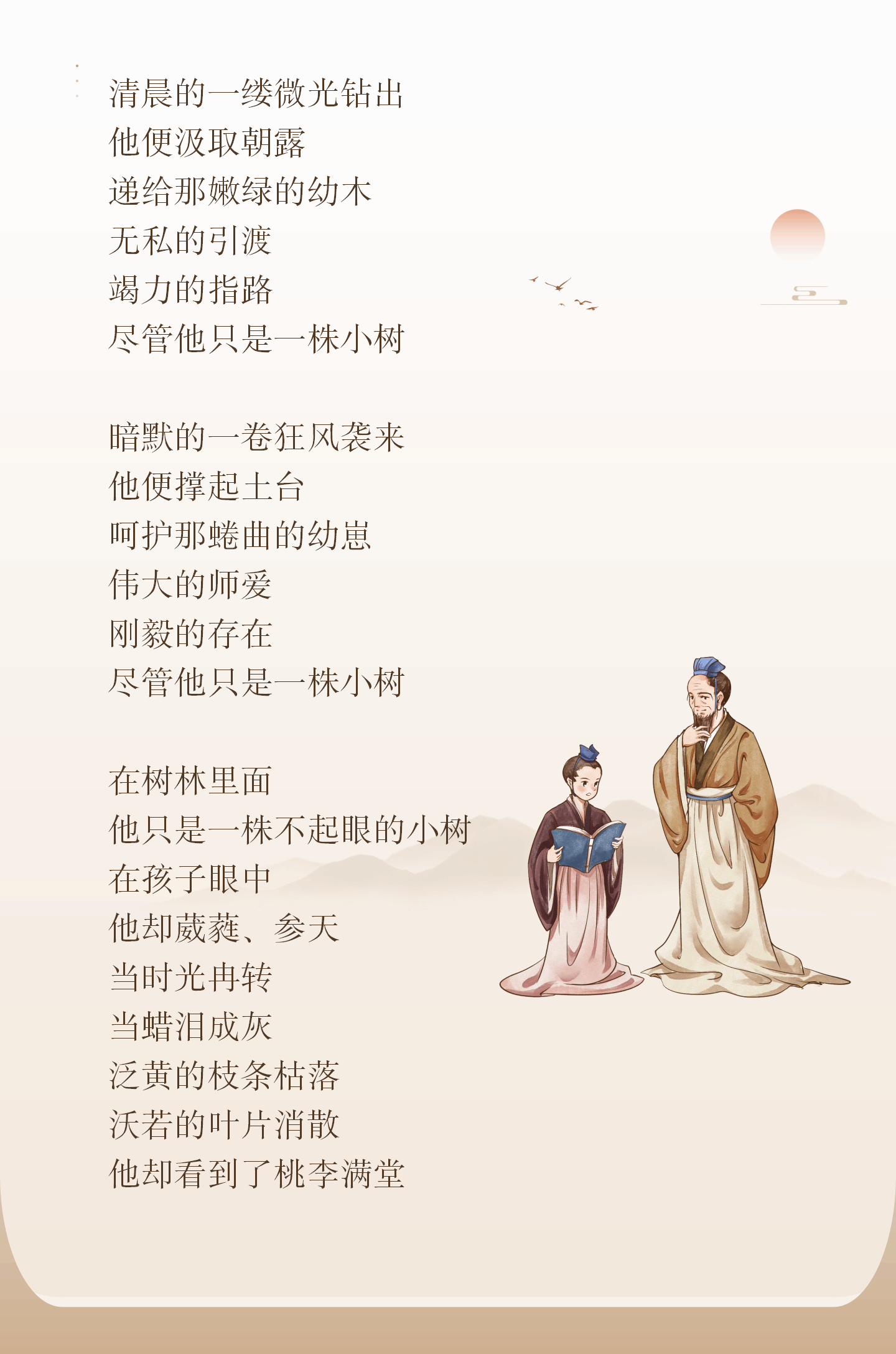 “三寸讲台育英才,一生青春献芳华”。今天是第四十个教师节,祝愿所有老师节日快乐! 在我们的人生道路上,除了父母的养育和教育以外,还有一群特殊人在我们的青春道路上留下了身影,用语言播种,用彩笔耕耘,用汗水浇灌,用心血滋润,这群人就是我们的老师。 为传承尊师重教的优良传统,学院特举办“感念师恩 ”图文创作活动。近期,学院收到了同学们创作的几十件书法、绘画、海报、诗歌作品,请各位老师快快查收! ![]() 诗歌创作类