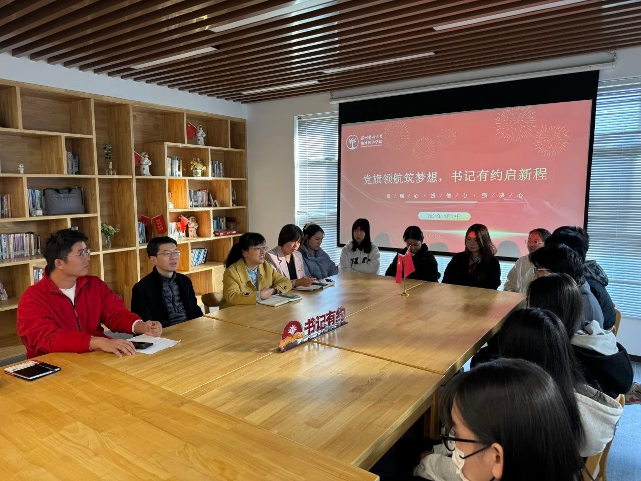 近日,我院在社区“我家书房”开展“书记有约”师生座谈会,座谈会以“党旗领航筑梦想,书记有约启新程”为主题,邀请20余名毕业班考研学生参与交流,学院党委书记许冬武,党委副书记、纪委书记涂艳玲以及各位学生党支部书记出席座谈。 “同学们好啊,今天我们主要是想和大家一起聊聊目前考研备战过程当中遇到的一些困惑,学院还能给大家提供什么帮助,大家都放松一些,不要约束”,“天气慢慢凉起来了,大家有没有把厚衣服带到学校啊?”.....,许书记一句句温暖的话语让在场的同学们立马放松下来,现场氛围热烈且活跃。“老师好,我们能不能向学院争取一个考研教室,方便我们最后冲刺学习?”,“老师,我想了解一下有关考编考公的复习策略”....,同学们笑容满面,争先恐后的抛出自己的疑问和心声。
