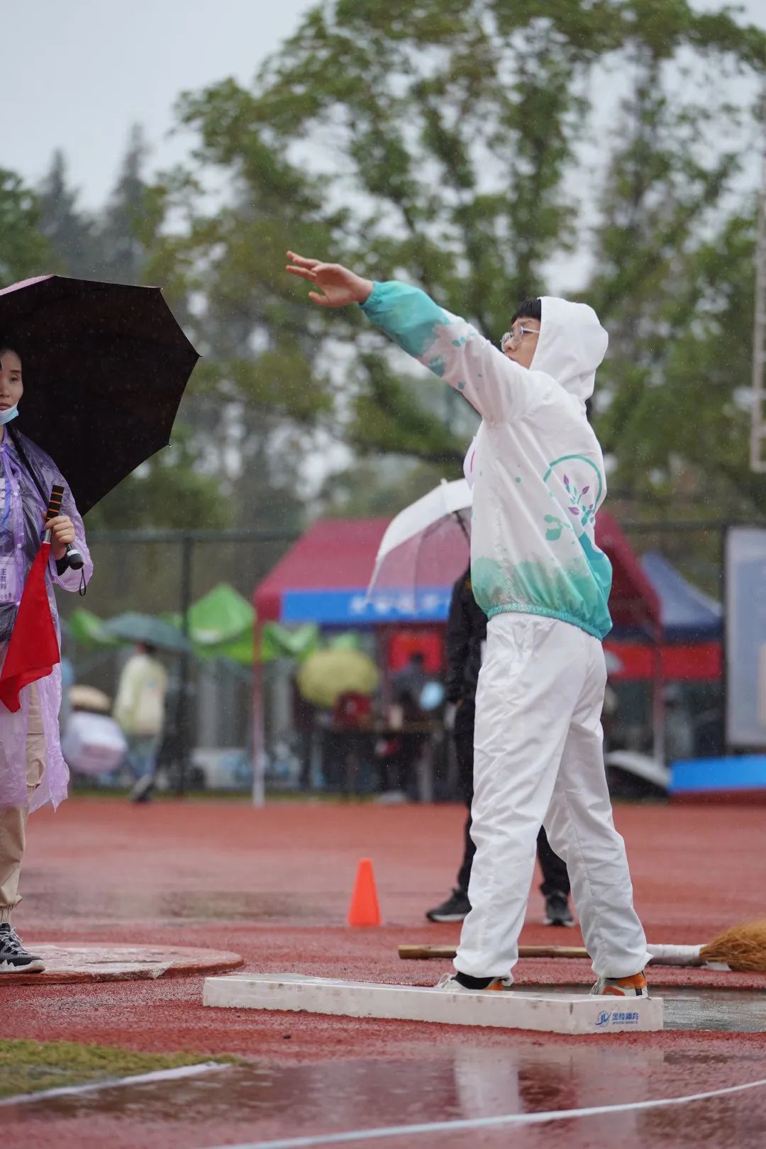 尽管前路阻碍重重,唯勇气所向披靡。顶着大雨,来自20级精神3班的曹迅瑜克服重重阻力在男子110米栏中拿下第八名。