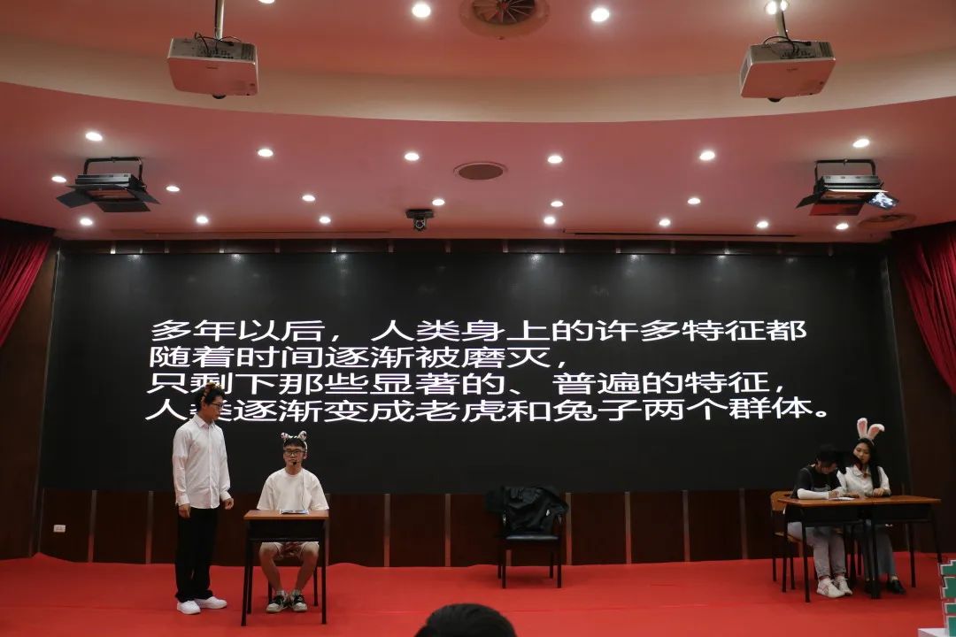 在心理专业技能成果展示环节,“心理情景剧”、“心理主题班会”、“心理咨询技能”作为应用心理学专业最能体现专业特色的三大技能,同学们用精彩的表演和精湛的设计向在座的师生送来了一场丰富的精神大餐。心理情景剧《不被定义的梦想》借用童话的形式,将男生女生转化为老虎和兔子,来讲述他们直面困难,打破标签的故事。故事简单,但是耐人寻味:在多彩的世界里,每个人都是各具特色,每个人都是独一无二的存在。心理主题班会《卡普曼三角》借用卡普曼三角形帮助同学们了解受害者,迫害者和拯救者三者关系,并进一步的掌握跳出卡普曼三角形漩涡的方法,以解决一些日常生活矛盾问题,最终帮助同学们建立更加健康的人际关系。在心理咨询《第三只眼睛》展示环节,两位心理专业同学分别化身专业心理咨询师和被咨询客体,现场展示了如何通过专业的心理干预知识来进行实际生活中的心理咨询。活动现场,我院学子与温州大学城附属小学的同学们们一起朗诵诗歌《敬告青年》,表达青年学子励志图强,坚守信念,请党放心的坚强决心和顽强意志,也表达了即将走上新征程的同学们有强烈的使命感和责任感,做一名对国家、对社会和对人民的有用之才。