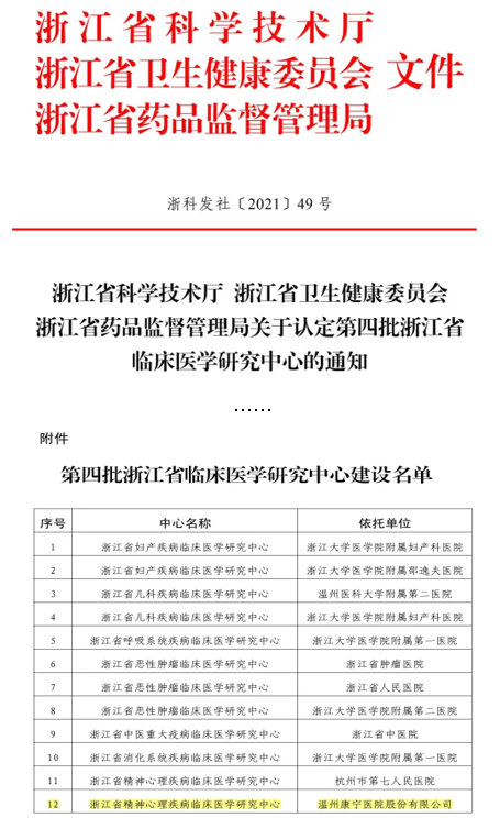 11月,在浙江省科学技术厅印发的《第四批浙江省拟建设临床医学研究中心名单》中,我校宋伟宏院士牵头以偷拍视频 附属康宁医院为主体申报的浙江省精神心理疾病临床医学研究中心成功获批。其全面融合偷拍视频 附属康宁医院、老年研究院、偷拍视频 精神心理国家一流专业,依托浙江省阿尔茨海默病研究重点实验室、浙江省数字精神医学国际合作基地,温州市儿童精神病重点实验室,组建了老年精神病研究、儿童青少年心理精神疾病研究、数字精神医学三个专业研究团队,为浙南地区首家精神专科医院临床医学研究中心。
