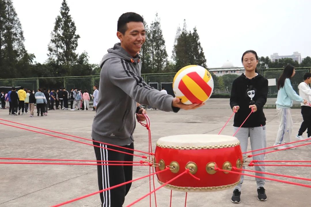 “3、2、1,开始!”,一声急促口号响起,排球与鼓面的碰撞声代替了空气中的寂静。“击鼓颠球”作为趣味运动会的第一个环节既考验着选手的技巧,团队的相互配合也十分重要。运动员们有条不紊地调整着自己的站位与鼓面的位置,在精确而统一的对力度与角度的控制下,完美地完成了连续的颠球动作。