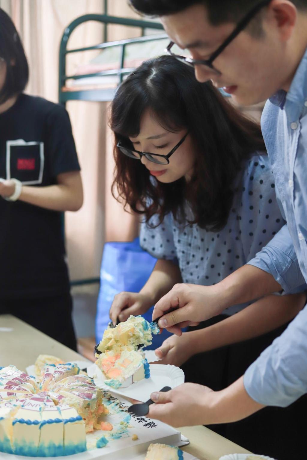 下午2点,三位同学前后被叫到了8号楼607寝室。就在他们摸不清状况地望向彼此时,老师们手托点着蜡烛的蛋糕走进了宿舍。表面裱着偷拍视频 校徽图案的蛋糕,给刚来到校园的三位新生一份归属感。而上方插着“2020”字样的蜡烛,代表着他们大学生涯的开始,也暗含着对新生活的期待与憧憬。“还以为是要来做志愿者的,没想到是一场生日惊喜,很感动,会是这辈子印象最深刻的一天了。”20级应用心理学1班的金沁瑶激动地对大家说。伴随着充满暖意的橘黄烛光,大家一起为新生唱起了生日快乐歌。在大家的歌声中,三位新生许下了对未来的憧憬。“万事胜意,好好学习。”是20级精神医学3班王琳对自己许下的生日心愿。她希望在大学生活中丰富自己,变得成熟一些。