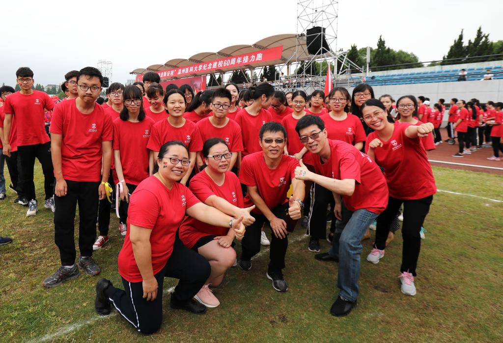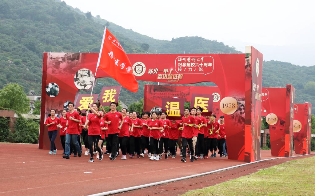 师生衣着校庆logo衫,脸贴校庆图案,以饱满的精气神迎接校庆跑。在金理奏书记和许冬武副院长的带领下,我院师生从操场出发,穿越6道时光之门时喊出了响亮的口号——“爱我温医,追求卓越,再续华章”,穿过居里桥,绕过图书馆,以矫健的步伐奔向校庆跑的终点,借此表达学院对于温医甲子校庆的祝福。