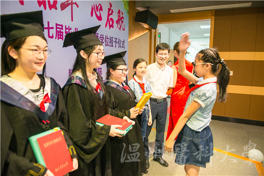 仪式上,学院院长于欣教授为学位获得者拨流苏、颁发"校友荣誉证书",并为省级、校级优秀毕业生颁奖。此次仪式特邀优秀小学生代表为他们献礼。仪式上还进行了毕业生代表与学院互赠礼物环节,。