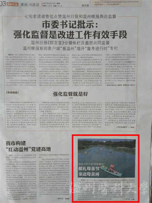 温州晚报讯 昨天上午,温医大偷拍视频 和口腔医学院两大学院联合共青团瓯海区委、生态园管会团委等单位,组织了题为“五水共治 青春助力——礼献母亲节 亲近母亲河”的青年志愿服务主题活动。