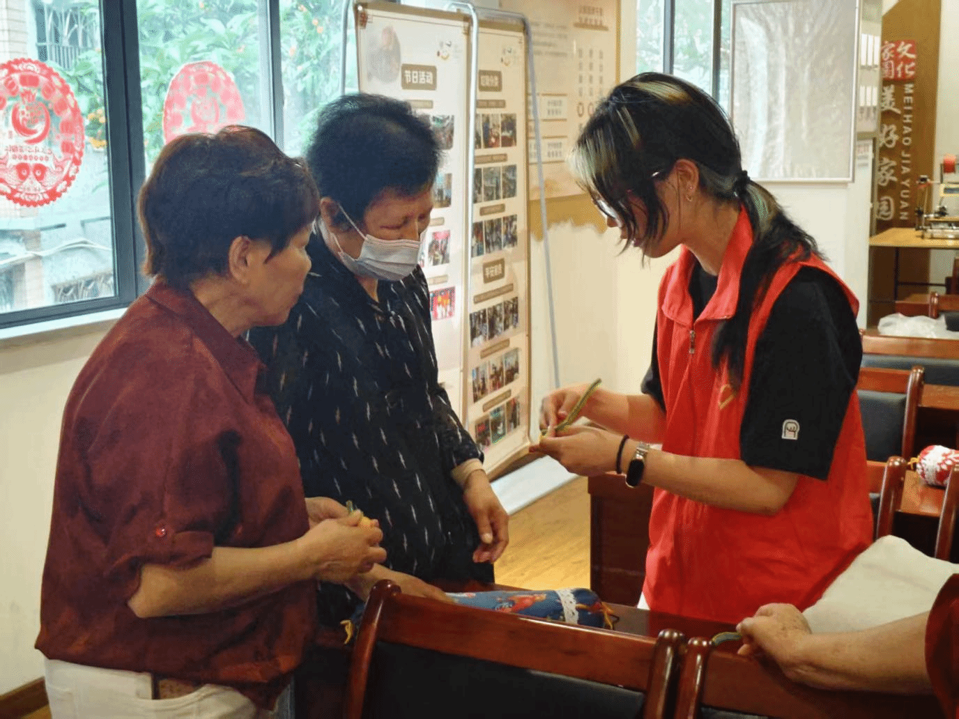 在剪爱公益中心的组织下,志愿者们引导老人开展丹田环活动来缓解久坐后的身体疲劳。她们耐心地带领老人们反复练习丹田环动作,助力老人掌握日常简易锻炼方法。丹田环活动不仅能放松身体,还能强化老人的核心肌群,提升身体平衡感与协调性,增进老人的整体健康活力。